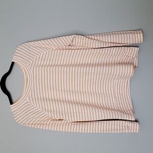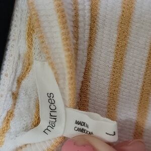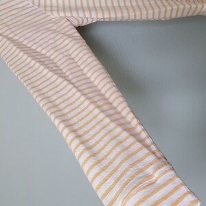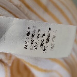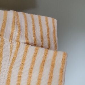 yellow and creamish color. Has a terrycloth feel. Minimally stretchy. Side split hem. Great condition.