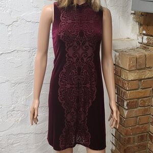 Sleeveless deep red marron velvet short turtleneck dress by maurice's size medium, velvet over lay featuring sheer design down front, looks see through it isnt though but has a inside lining. Excellent gently used condition!! (I have it pinned to show style in the first few photos, 5th photo shows the actual size of the dress)