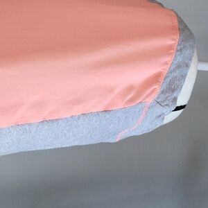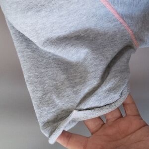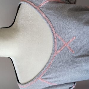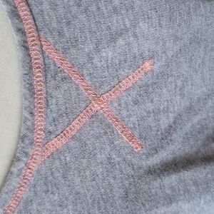 The front is a heather gray lightweight sweatshirt material with hot coral stitching.
