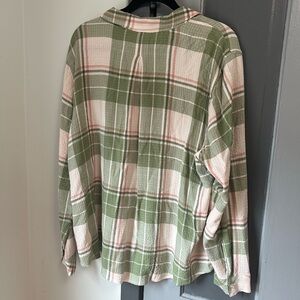 This stylish plaid button-up shirt features a classic design with a comfortable fit. Perfect for casual outings, it combines green and cream colors for a timeless look.