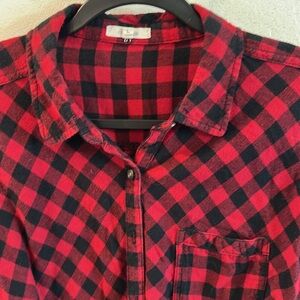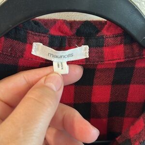 Maurices, red and black flannel button up top, size large, excellent condition