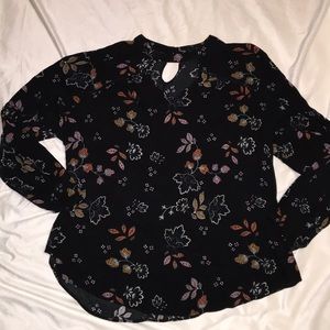 Black floral top with long sleeves from Maurice’s. Has mustard, navy, and orange design. Features cut out/collared neck and cut out in the back as well. Sleeves are banded with elastic