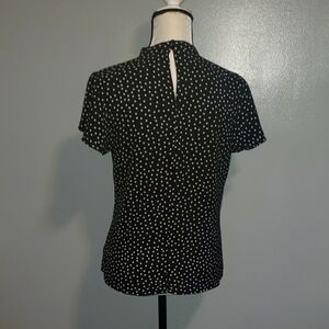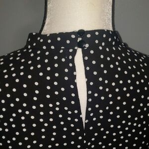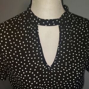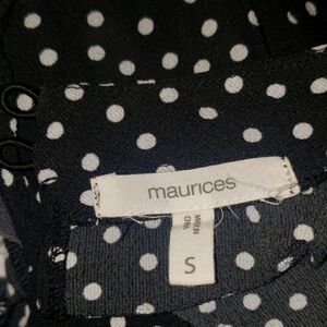 Maurices, black blouse with white polka dots, size s, 96% polyester 4% spandex.