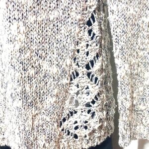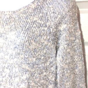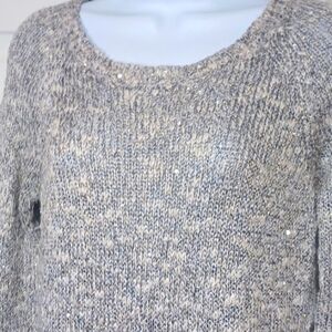 this is an absolutely gorgeous sweater by Maurice's it's when you look at it you can see the colors of silver gray white and a hugh of a very light blue really pretty all mixed together and it's got scattered sequins throughout it's got a great larger than normal round neck almost like a boat neck long sleeve it's a very light knit so it's not a heavy knit and then when you come down to the side panel on the bottom it has lace going in like a triangle so it starts off small and gets a little wider as it goes down and it's on both sides of the bottom so you can see it half in the front and around to the side and then the back top portion is all lace of the sweater as well just the upper back not the shoulders it's really a gorgeous sweater!!! it's a size medium and the measurements are approximately lying flat pit to pit 21 inches the length from top to bottom is 25 in beautiful sweater