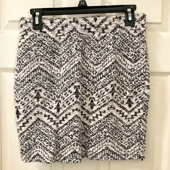 Maurices sweater style mini skirt with striped metallic shimmer knitted. There is a slight roll to the band but when on it resolves.