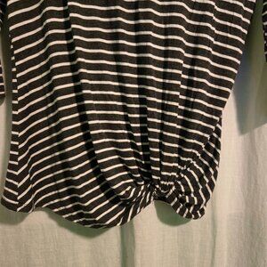 Maurices 3/4 sleeve tee with round neckline. Gray and white thin horizontal stripes. Twist hem.