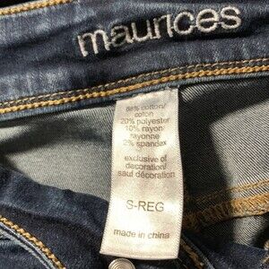 Maurices skinny jeans size small regular inseam. These are very stretchy - with 68% cotton 20% polyester 10% rayon and 2% spandex. Has two back pockets, but the two front pockets are faux. There is one small pouch pocket on the front panel of the jeans.