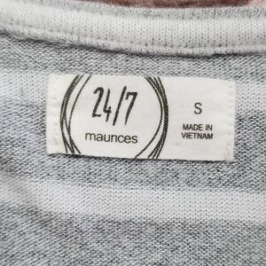 Elevate your casual wardrobe with this stylish Maurices 24/7 women's top in size Small. Featuring a soft light gray and white horizontal striped body paired with contrasting dark floral raglan sleeves, this top blends cozy comfort with eye-catching design. The lightweight knit material is super soft with great stretch—perfect for everyday wear, lounging, or layering.