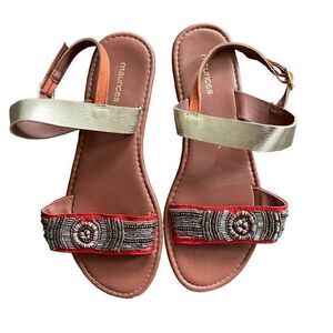 faux leather adjustable strap around heel is faux suede goldtone metallic strap beaded strap padded footbed