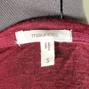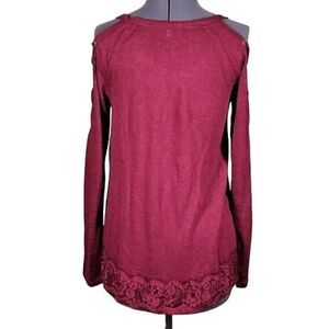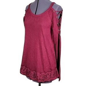 Long sleeve burgundy shirt with laced peek-a-boo shoulders and lace trim at the hem.