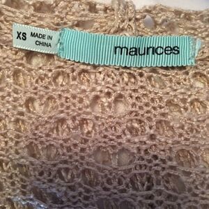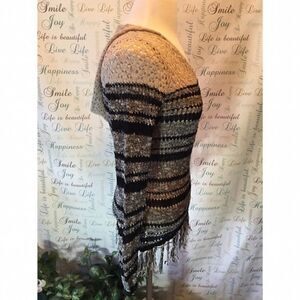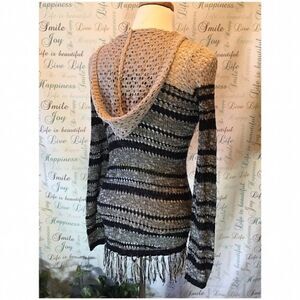 Lightweight, loosely knit hooded top. Tan and black striped, long sleeve, fringed top. Great as a cover up or with a tank top