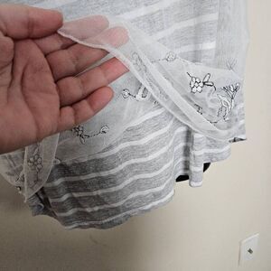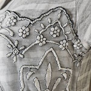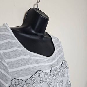This is a short sleeved tunic by Maurices. It is grey and white striped and has a sheer mesh overlay that features embroidered detailing.