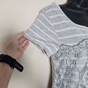 This is a short sleeved tunic by Maurices. It is grey and white striped and has a sheer mesh overlay that features embroidered detailing.