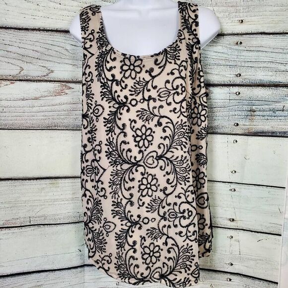 Elegant sheer overlay tank with floral lace design over nude lining. Flowy fit with scoop neckline. Perfect for layering or evening wear. Size 2 (Plus).