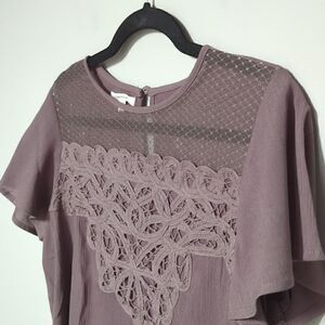 Pretty purple short sleeve blouse. Sheer panel on the top with lace overall. Button closure on back with key hole opening