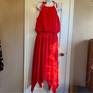 Elegant red halter maxi dress. Features a flowing skirt and tie straps. Perfect for any occasion