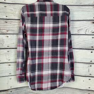 Classic red and black plaid button-down shirt from Maurices. Lightweight cotton-blend fabric makes it ideal for layering or wearing alone. Great for casual outings or fall styling.
