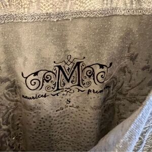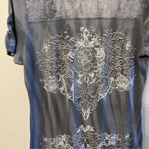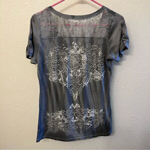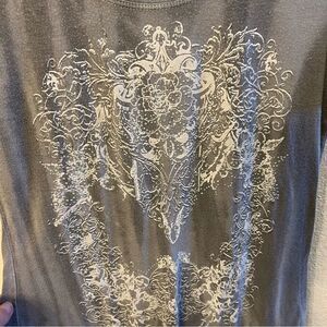This fun embellished short sleeve tee is from Maurices. The item is gray with an embellished pattern on both the front and back. There is also a lace like pattern along the back neckline. The size is small. The measurements are 26” L x 18” W (pit to pit) x 7” sleeve (shoulder to cuff). This tee has been gently worn but is in very good condition.