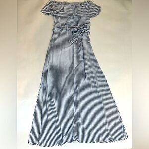 Maurices Striped Off Shoulder Summer Dress - Size (M) White/Jean Blur stripes, off shoulder, fully lined till leg slit on dress (slit is 22” from hem - see photos), belted at waist. Good condition, normal wear