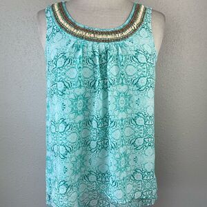 Love the vibrant colors and beaded design at the neckline on this tank top by Maurice’s. It measures 17 inches armpit to armpit and 25 inches in length.