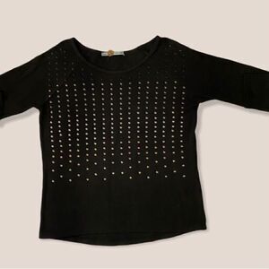 Black 3 1/4 sleeve knit sweater with silver, gray and black bling. Looks great for casual style with pair of jeans or can be dressed up for a more sophisticated look! Polyester/rayon/ spandex blend. Wash inside out. Missing one gem-see photo