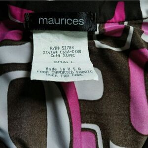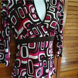 Maurice's Tunic Top. Women's size Small. Geometric design in hot pink, brown and white. Polyester Spandex fabric. Elbow length sleeves. No flaws. Great with leggings!