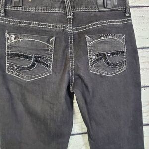 Stylish and edgy Maurices skinny jeans in black with distressed sequin detailing on the front and back pockets. Soft stretch fabric for comfort and a flattering fit.