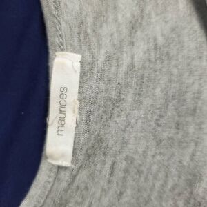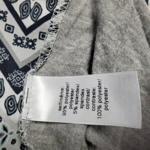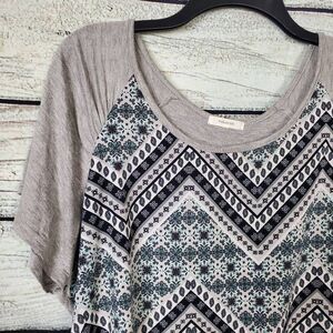 Maurices short sleeve top, size Large. Gray heather raglan sleeves with contrasting black/white chevron boho print front. Soft stretch fabric (95% polyester, 5% spandex; contrast 100% polyester). Flowy and lightweight.