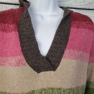 Cozy Maurices pullover sweater in earthy stripe colors with attached hood. Wool blend for warmth, perfect for layering in fall or winter.