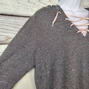 Maurices women’s knit hoodie sweater in gray/black mini-stripe with blush pink lace-up neckline detail. Size 0 (fits like XS). Lightweight stretch knit, long sleeves, casual relaxed fit.
