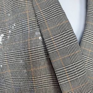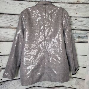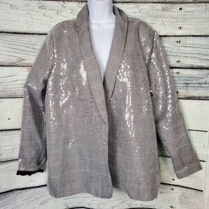 Gorgeous Maurices blazer in a gray plaid pattern with shimmering sequin overlay. Features an open front, long sleeves, and fully lined interior. Perfect statement piece for work, holiday parties, or a night out. Women’s size 2X.