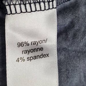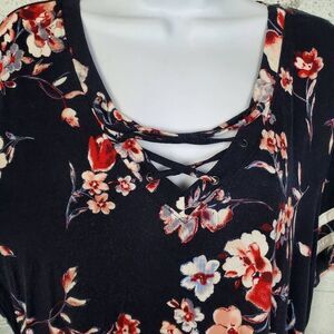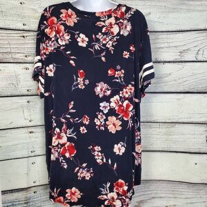 Floral short sleeve tee from Maurices in size XXL with red and blush pink flower print on navy. Features criss-cross detail at neckline and varsity stripe sleeves. Soft and stretchy fabric blend.