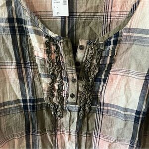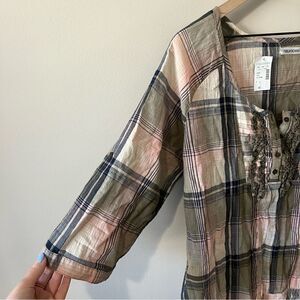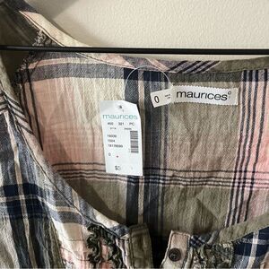 Maurice’s plaid top NEW with tags Size 0 Green and pink plaid Button front detail with ruffles V neck Waist tie 100% cotton SST
