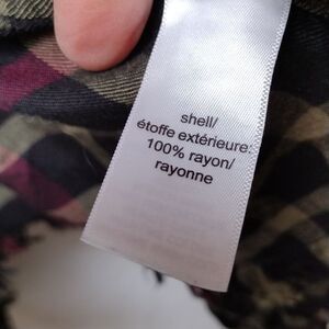 rayon, plaid vest with collar to look like wrap, finged edges. one size, see measurements