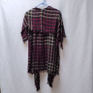 rayon, plaid vest with collar to look like wrap, finged edges. one size, see measurements