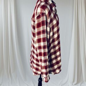 Maurices women’s XL red & white plaid long button up shirt with center back buttons.