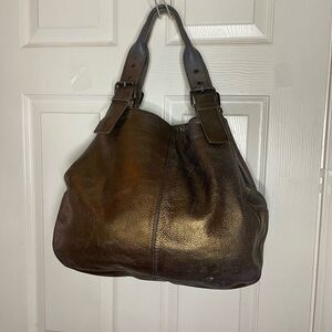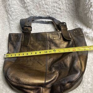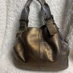 Maurizio Taiuti leather metallic Bronze large tote antique tone buckles .Top snap closure the inside lining has a side zipper and two side pockets.Pre owned in FAIR used condition because the metallic color is faded no tear small ink stains on the lining.see all pictures any questions please message.M5