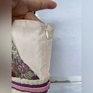 Runway y2k chiffon silk dress with velvet trim soft colors , shades of green, pink , cream , in very good shape near the zipper is a light dust stain not noticeable it can be dry cleaners . Rare find