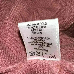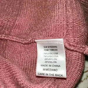 This is a pre-owned Love Tree women's sweater in size M. It is made of 74% viscose and 26% nylon. The sweater is a dusty rose color and features a unique design with horizontal rows of fringe. The sweater is in good condition with no visible signs of wear or damage. The sweater is a cropped style and has long sleeves. The sweater is machine washable and should be hand washed cold, do not bleach, dry flat, and do not iron.