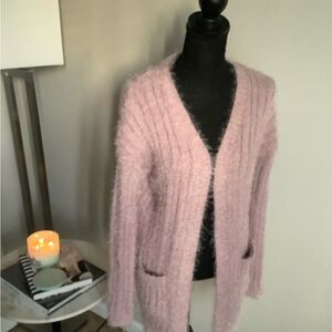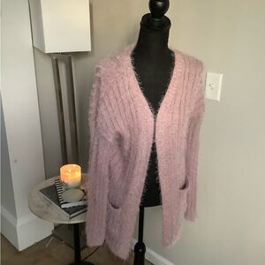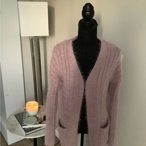 Open neckline and no closure and fuzzy knit. Great stretch!