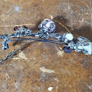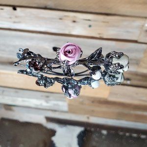 Mauve & Olive Silk Petite Roses Barrette with Pearl an Garnet Crystal. This small hair clip is metal with silk roses and metal leaf detail. Very sturdy. Designed to hold a portion of hair back, not contain all of your hair. The mechanism works great. Measures 2 3/4" long and 1" at it's widest point.