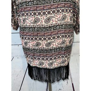 Mauve Open Front Cardigan Lagenlook Fringed Paisley Sweater Shirt size Medium. Style ST8232 Black, red floral paisley pattern. Batwing sleeve. 96% Rayon 4% Spandex. Made in Mexico. Pit to pit 29", back bottom of collar to bottom of shirt 29". Great preowned condition with no rips or stains. perfect for the business casual preppy student career working woman.