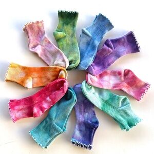 Ice dye colorful cotton crew socks. Hand dyed in small batches to create a custom finish as pretty as a watercolor painting!