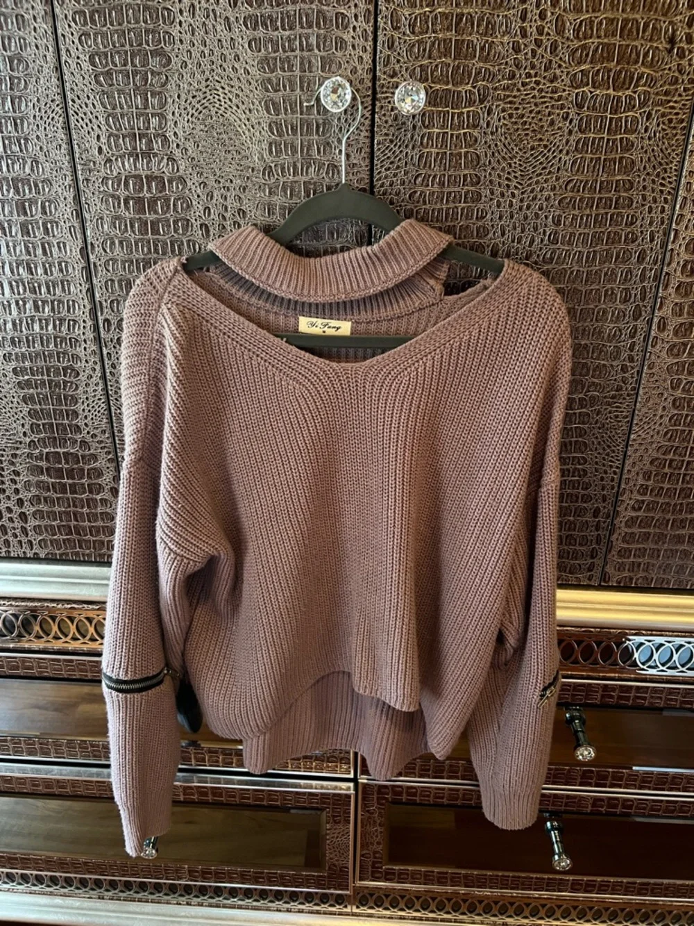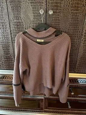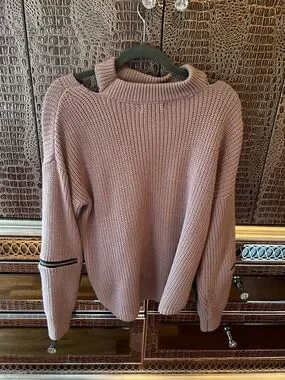 Chunky ribbed knit with a mock neck and cold-shoulder cutouts.