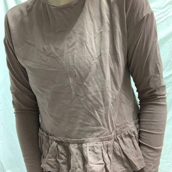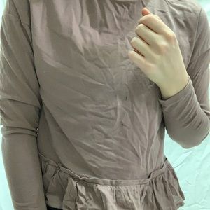 Mauve long sleeve top. Ruffle peplum detail. Slightly cropped.