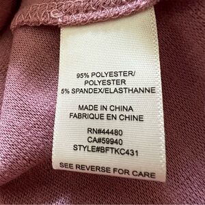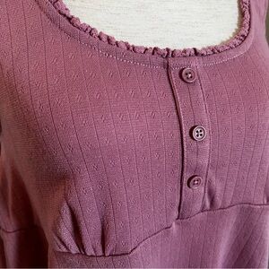 Feminine mauve tank top with ruffled trim neckline. Features faux button accents. Subtle fabric texture. Lettuce trim hem.