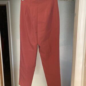Mauve high-waisted trousers to mix up your workwear look! Front zipper enclosure and nonfunctioning pockets. Flat pleats across the front and back rise lend a tailored look. 14.25" waist seam-to-seam and 26.5" inseam. Interior fastener button missing.