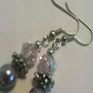 Victorian style dangle drop pearl earrings with mauve and white pearl, pink crystal and silver accents.