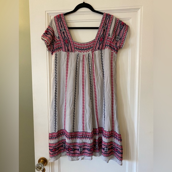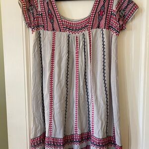 Mauve brand boho style casual dress. Size small. Pit to pit 18 inches. Length 36 inches. Grey with blue and pink pattern