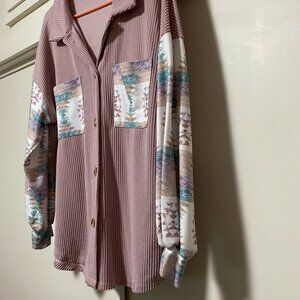 Mauve button-down shirt w/Indian design partial sleeves & pockets, size L
